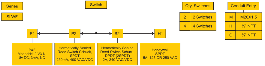 Explosion proof box with (2) hermetically sealed switches, 3/4 conduit entries, black enclouser with stainless steel bracket suitable for 80X30 tapping and for 20mm pinion height, with ATEX Cerificate